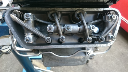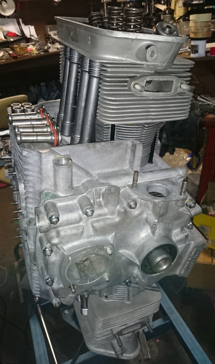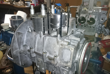 The crankcase is "numbers matching" and has been line-bored to second-oversize. It has the late-type oil pump, late rockers, late B heads, etc. It is fitted with mew modern biral (aluminum fins over iron) big-bore (86mm) cylinders with higher-compression ratio (9.5:1) pistons.