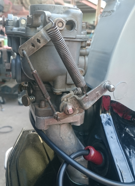 AT RIGHT: Here, the large hole in the top of the carburetor can easily be seen. Normally, one replaces the top with one that hasn't lost this "soft plug". However, none were to be found at a reasonable price, so a plug was made and installed instead. It's visible below, but not this close-up. Also note the reproduction spark plug wire end. These were briefly back in stock a few years ago but withdrawn from the market because they often go faulty as, indeed, this set did during running tests on the dyno prior to the run-in phase.