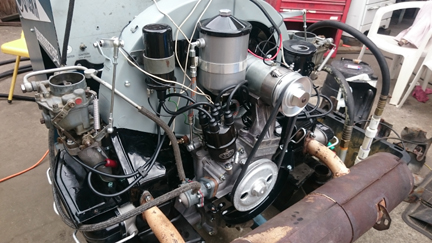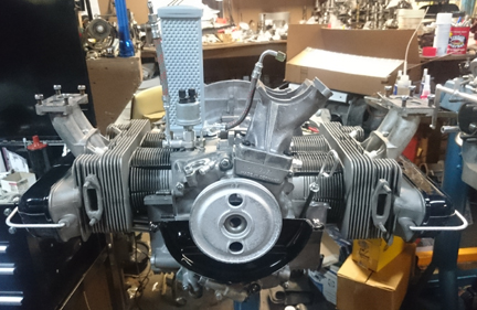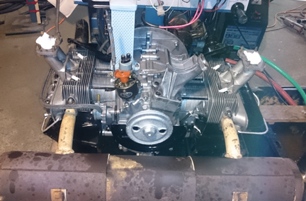 ABOVE RIGHT & BELOW: Note that the tear-down required to clean up the oil was considerable! All the upper sheet metal had to come off. Later, the loaner exhaust and flappers were removed and replaced with clean ones! The new cooler seals are a reddish pink! Also note that during the dyno running phase before a load is placed on the engine, the distributor was checked for proper advance curve and shown to have weak return springs. So, while they were being replaced, this 022 was used for the run-in instead. It was swapped back to the BR18 just before the final running seen below.