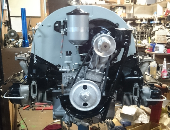 AT RIGHT: Rear view as the engine assembly proceeds. The valve covers and pulley shroud are powder-coated, and most all the hardware (including the valve cover bails, crankshaft pulley, dip-stick and a lot of smaller pieces) have been plated, though the real emphasis isn't on "bling", but just a quality assembly.