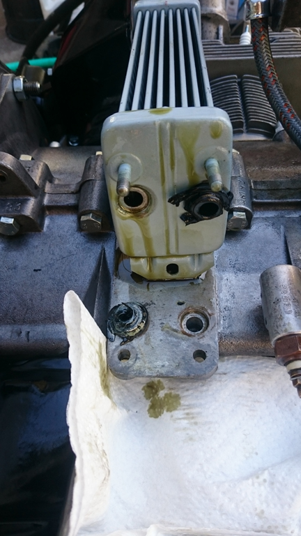 BELOW, LEFT & RIGHT: At about 45 minutes into the run-in process, at a little over 3000 RPM, both oil cooler seals burst! It made a huge mess! Post disaster investigation concluded that it was a time & temperature based failure as both burst within seconds of one another - faster than I could realize what had happened and shut it down! The seals were replaced with aftermarket ones made of better type of material favored by people who run their engines very hot. Note that the vast majority of the oil was already cleaned up by the time these photos were taken! It was positively everywhere!