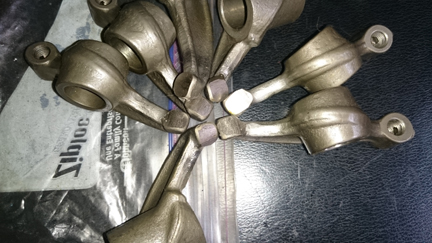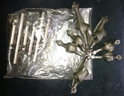 BELOW, LEFT & RIGHT: The rockers, cleaned and hard-faced. In the close-up on the right, one of the rockers is rotated slightly, so you can see the thick, hard-face material as a distinct layer over the original rocker material. The rocker shafts have been polished, of course! And, one rocker seems to have been set on the work bench for when these photos were taken! Oops, to late to re-stage the photo now!