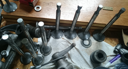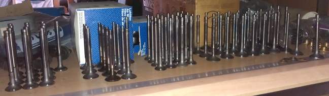 Generally, if a customer provides a core, I keep their valves with the project, and for my own work - engines done on speculation or for myself - I do batches of valves (they're cleaned, refaced and stems polished) from which I select the set of valves to be installed. In this case, however, the "core" valves were mostly not serviceable. In several cases, the valves had been refaced too many times and would be too thin, and the remainder had too much stem ware - no doubt due to the terrible oil that was circulating in the engine. So, I grabbed a set from here: