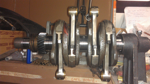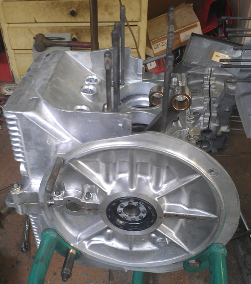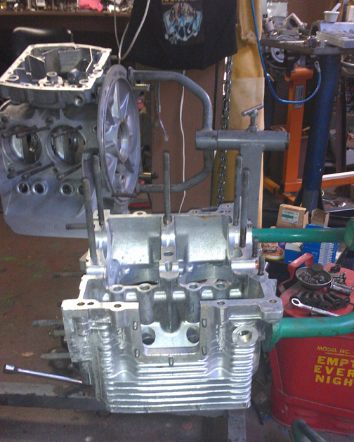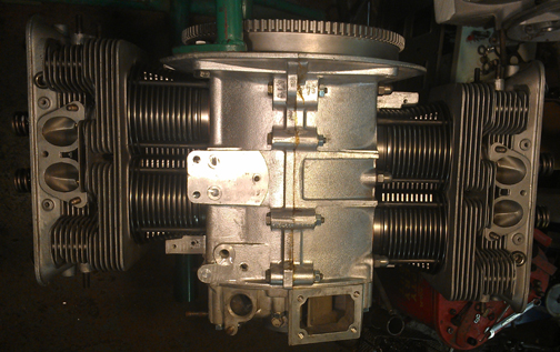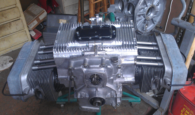 In this first one, at right, though the lighting is poor, you can see all the features previously described coming together - the balanced 912 crank, the rebuilt rods, the parkerization, the refaced lifters, and that red case sealant (cam end-plug)!