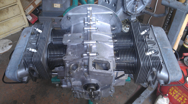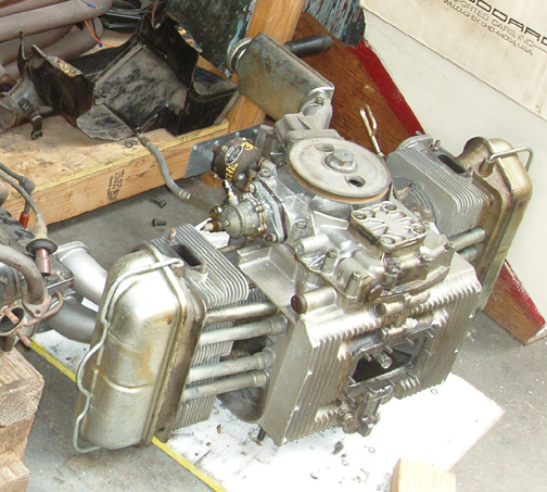 A high-school friend of his was the original owner of the vehicle this engine came from. In 1967 or '68, when the car was 4 or 5 years old, the engine needed overhaul and the gentleman elected to have Porsche do the work, so it was sent back to Germany. Apparently, it took a long time and when it came back, in his excitement, he drove the vehicle a bit wildly and stuffed it into the back of a truck. With the car gone, my friend helped guide the engine to another friend of his, Parnelli Jones (famous in air-cooled 1/4 mile, land-speed, and other racing venues in the LA area), who put the engine in a "dune buggy" based on a shortened VW chassis. However, apparently some kids broke in and the vehicle got vandalized shortly thereafter while in the shop of "The Engine Compartment" - predecessor to the well known firm "West Coast Metric" (think Lorn Pearson). As the vehicle was non-operable, and as the engine was exposed with easy access, various parts were taken off of it for other projects, until it wasn't much more than a long-block. And there the engine sat, in the buggy in Mr. Jones race shop, until Mr. Jones was old enough to retire and the shop shut down. During that process, the engine traded hands to a guy named Kevin, one of the people helping close the shop, who conveyed it to my friend from whom I got it.