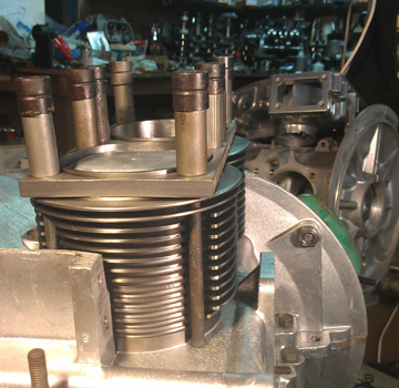 Here you can see them being fitted for height comparison check - this is done to ensure that there are no difference between the cylinder heights that the head itself "sees." The book value for tolerated error is 0.1mm (four thousandths of an inch), but in this case, there was no measurable difference between one pair, and less than 0.0015" (less than one point five thousandths of an inch, or 0.0275 mm) for the other. I suspect that these cylinders have better quality control - in particular, more consistent heights - than the more familiar iron cylinders, though I haven't yet had enough sampling size to feel sure that's true. At least these and another set I installed all matched exactly.
