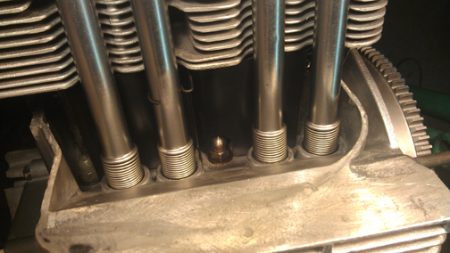 Then fit the oil drain plug, and sump screen and plate. Of some small note is that all the sump studs are original and in fine condition. I used new cap-nuts to protect the studs into the future.