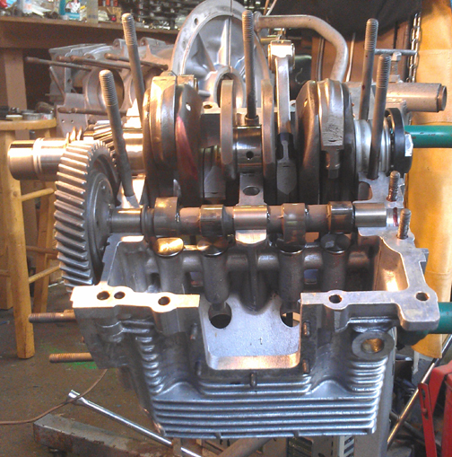 Next, one sets the crank in place and checks the fit of the camshaft. The gear is a zero and seemed a little loose to me, so I tried five different gears to obtain a better fit but nothing worked better than the original gear, so I put it back on!
