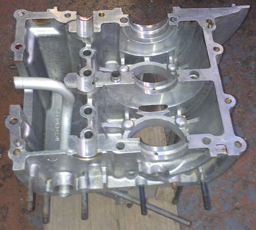 Preparation All I had to do was wash it, give it a visual inspection, torque it up, measure the bearing bores, and measure the cylinder spigots (on each side) to ensure they're all in the same plane with their neighbor (and not angled or of differing height). These checks revealed no flaws. The crankcase is in fantastic condition.