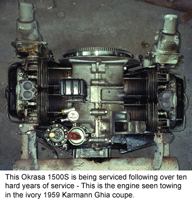 Okrasa engines varry greatly in their abilities because there is so much variety in the parts that go into them. From the factory's stock engine's famous 36hp (sae), Okrasa engines immediately add about half again more - to about 50hp - just by virtue of the improved breathing. When combined with a good camshaft, larger bore, and longer stroke, they are capable of over 75hp - enough to slip a standard 180mm clutch, sometimes enough to slip an improved 180mm clutch! (especially with modern non-asbestos clutch disks) For real-world examples, check out these images: