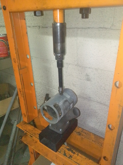 At right, you can see that we made a press tool that's based on the idea of using a generic hydraulic press to provide the pressure to keep the screwdriver inserted into the screw to be removed. What you can't see here is that under the press' ram, there's a spring between the ram and the part that provides the screw-driver function below it. The spring lets the screw driver go up or down as needed to install or remove while keeping high pressure on the bit to keep it in the slot.
