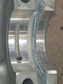 In the below image, the pulley bore of a two-piece crankcase is shown repaired. It needs repair more often than people might think! We have run into this problem so often, we created a web page that describes how it's done.