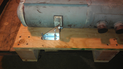 BELOW: Here are closeups of a simple, effective, inexpensive way to bolt down an engine using ordinary shelf brackets found at any retail hardware store. At left we see the flywheel end, and at right the muffler end. (Further below there's an image - not quite so close-up - that shows what to do if there's no muffler.) IMPORTANT NOTE: Each of the two M10 engine-to-transaxle mounting studs shown below left have TWO nuts threaded on them! One goes behind the bracket, not visible here of course, and the other can be seen. The two nuts get "backed together" to grab onto the shelf bracket and "jamb" themselves together so they won't come lose. (This also provides for some fore-aft adjustment of the engine in the crate.)