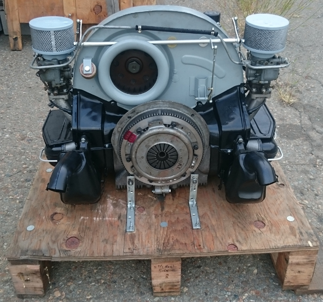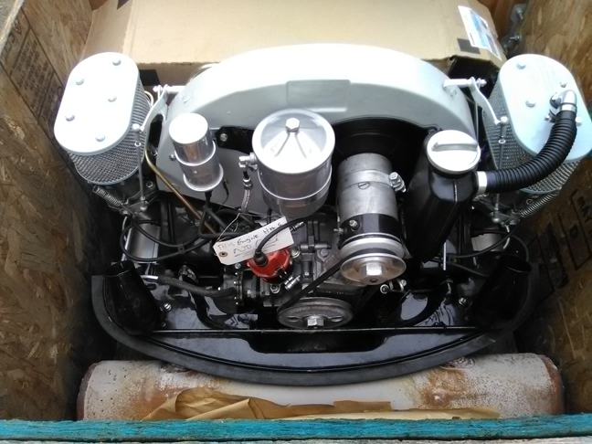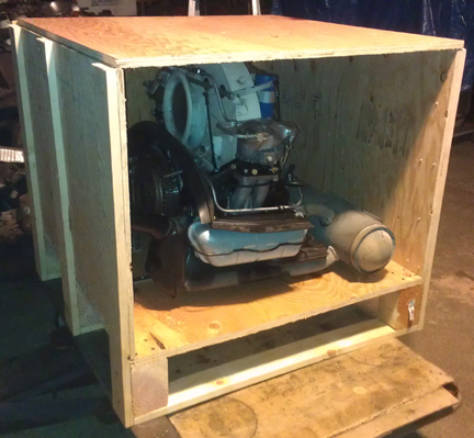 AT RIGHT: One of our engines about to be returned to our customer in our custom made crate. Note the ink markings near the brackets that that show customers how to fit either a 356 or 912 engine perfectly.